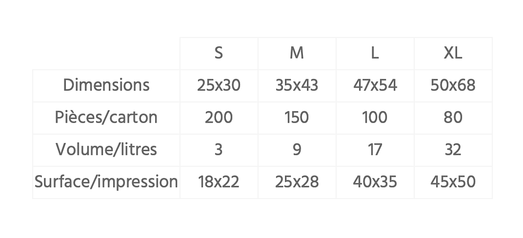 S : 25x30 | M : 35x43 | L : 47x54 | XL : 50x68